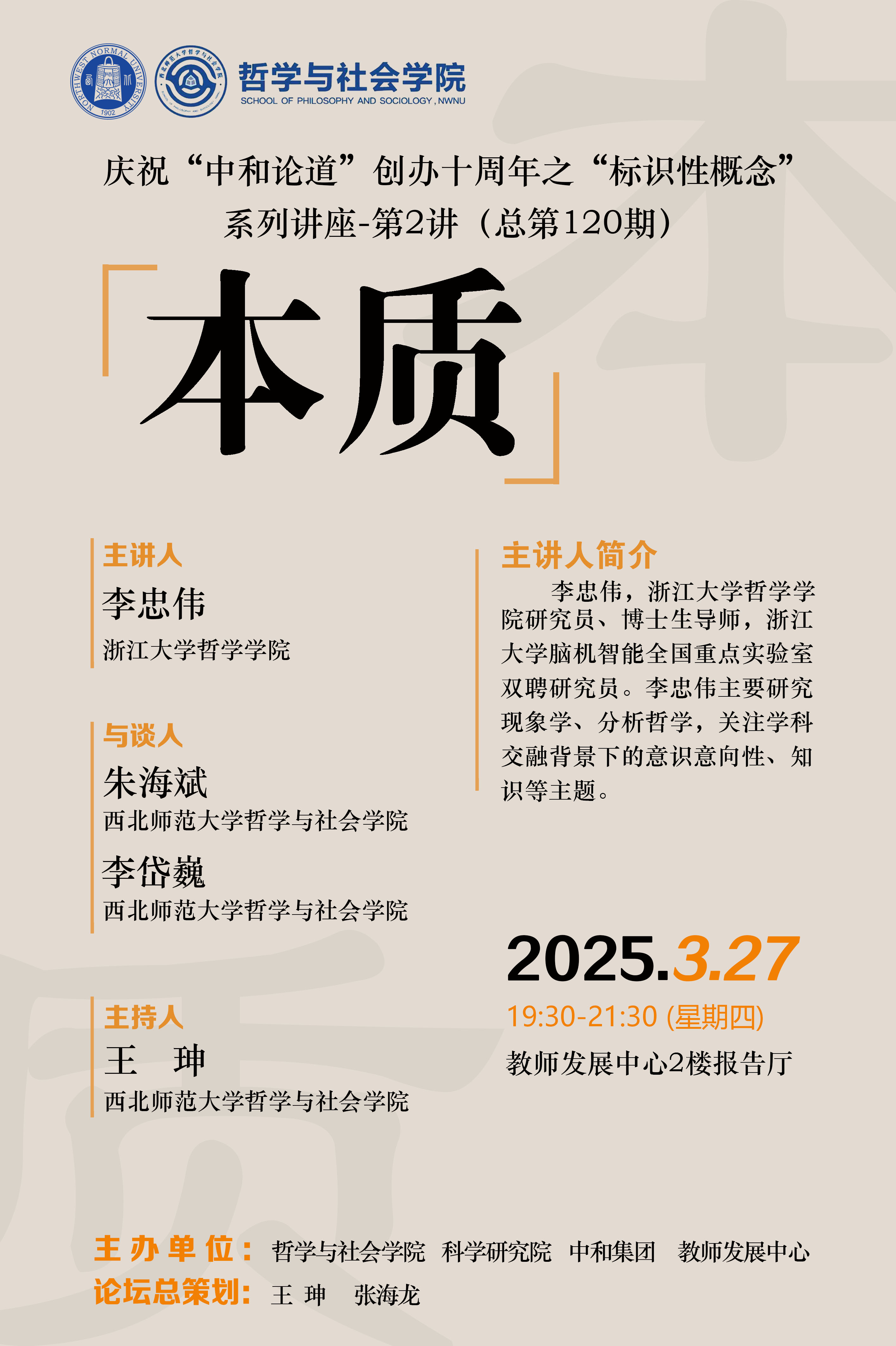 应beat365在线登录官网哲学与社会学院邀请,浙江大学哲学学院李忠伟研究员将来beat365作学术报告,该报告是哲学与社会学院庆祝“中和论道”创办十周年之“标识性概念系列报告之一。具体事宜公告如下: