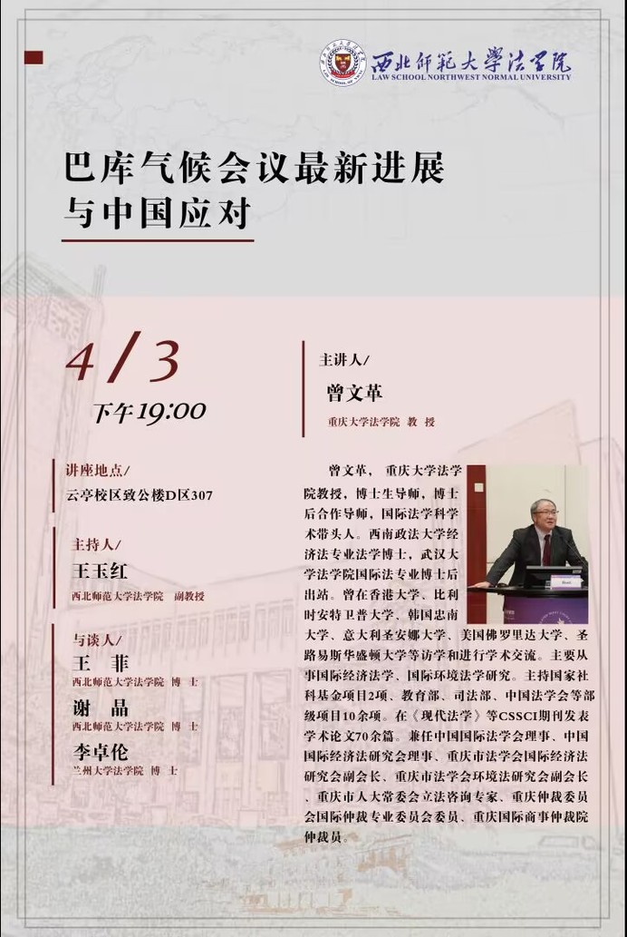 曾文革,西南政法大学经济法专业法学博士,武汉大学法学院国际法专业博士后出站。重庆大学法学院教授、博士生导师、博士后合作导师,国际法学科学术带头人。曾在香港大学、比利时安特卫普大学、韩国忠南大学、意大利圣安娜大学、美国佛罗里达大学、圣路易斯华盛顿大学等访学和进行学术交流。兼任中国国际法学会理事、中国国际经济法研究会理事、重庆市法学会国际经济法研究会副会长、重庆市法学会环境法研究会副会长、重庆市人大常委会立法咨询专家、重庆仲裁委员会国际仲裁专业委员会委员、重庆国际商事仲裁院仲裁员。主要从事国际经济法学、国际环境法学研究。主持国家社会科学基金项目2项,教育部、司法部、中国法学会等部级项目10余项;在《现代法学》等CSSCI收录期刊发表学术论文70余篇。