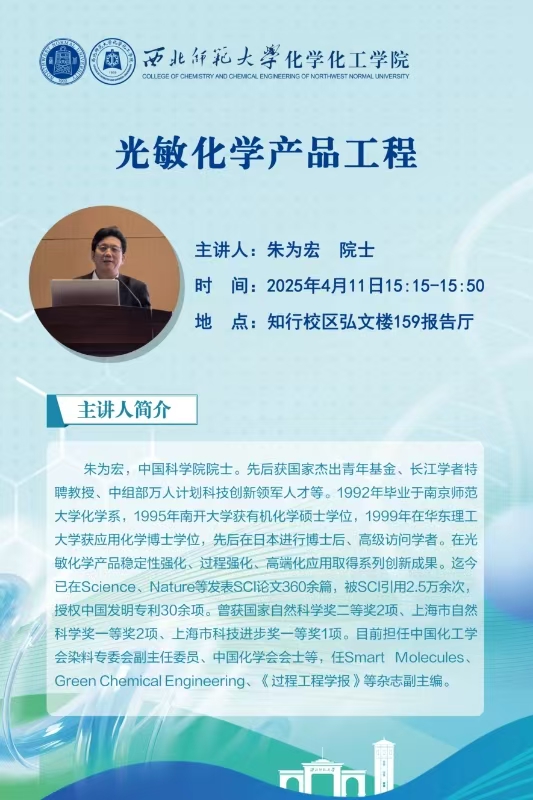 朱为宏,中国科学院院士,华东理工大学教授、党委常委、副校长,精细化工研究所所长,国家杰出青年科学基金获得者,教育部高层次人才,中组部万人计划科技创新领军人才,上海市科技精英,科技部重点研发项目首席科学家。兼任中国化工学会染料专委会副主任委员、中国化学会会士,Smart Molecules、Green Chemical Engineering、《过程工程学报》等杂志副主编。主要从事光敏化学产品工程研究,在光敏化学产品稳定性强化、过程强化、高端化应用取得系列创新成果。在Science、Nature、Nature Photonics、JACS、Angew. Chem.等SCI收录期刊发表学术论文360余篇,H指数为84,被SCI引用2.5万余次;获授权中国发明专利30余项;获国家自然科学奖二等奖2项、上海市自然科学奖一等奖2项、上海市科技进步奖一等奖1项。