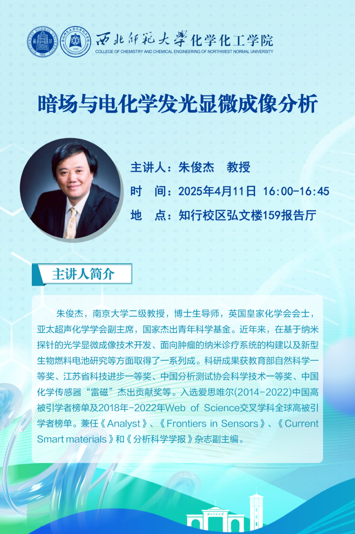 朱俊杰,南京大学二级教授、博士生导师,英国皇家化学会会士,亚太超声化学学会副主席,国家杰出青年科学基金获得者。兼任Analyst、Frontiers in Sensors、Current Smart materials和《分析科学学报》杂志副主编等。近年来,在基于纳米探针的光学显微成像技术开发、面向肿瘤的纳米诊疗系统的构建以及新型生物燃料电池研究等方面取得了一系列成。获教育部自然科学一等奖、江苏省科技进步一等奖、中国分析测试协会科学技术一等奖、中国化学传感器“雷磁”杰出贡献奖等;入选爱思唯尔中国高被引学者榜单(2014-2022)、Web of Science交叉学科全球高被引学者榜单(2018-2022)。