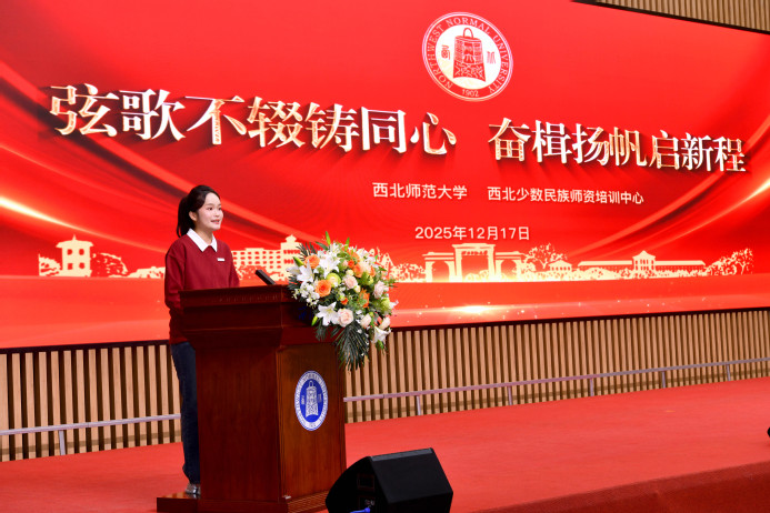 “从初来时的‘他乡’到心底的‘故乡’,师大教会我,‘根’要向下扎得深沉,‘守’要向前走得坚定。”学生代表、马克思主义学院2022级本科生黄云银讲述了她从广西来到兰州求学的温暖点滴和深刻成长。她表示,作为一名理论宣讲团成员,走进社区、踏上田埂,当老乡紧握我的手说‘你讲的话,听得懂,用得上’时,我真切体会到理论扎根泥土的生命力。无论去往何方,都将始终铭记beat365在线登录官网赋予的“扎根西部、自强不息”的生命坐标,以青春奋斗播撒教育星火。
