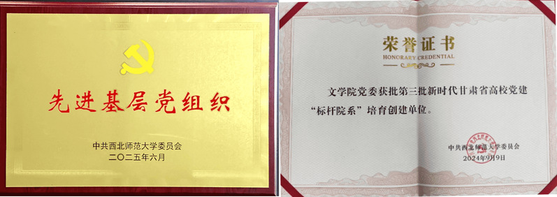学院党委坚持以政治建设为统领,聚焦“夯基础、抓品牌、重内涵、提质效”,以高质量党建引领事业高质量发展。“十四五”期间,学院党委入选第二批新时代甘肃省高校党建“标杆院系”;教职工第二党支部、研究生第四党支部分获学校“先进基层党组织”称号;教职工第二党支部书记侯冬教授入选甘肃省高校“双带头人”教师党支部书记培育名单;学院获校“弘扬师大精神 涵养良好家风”主题征文“优秀组织单位”,中国古代文学研究所获校“师德先进集体”。