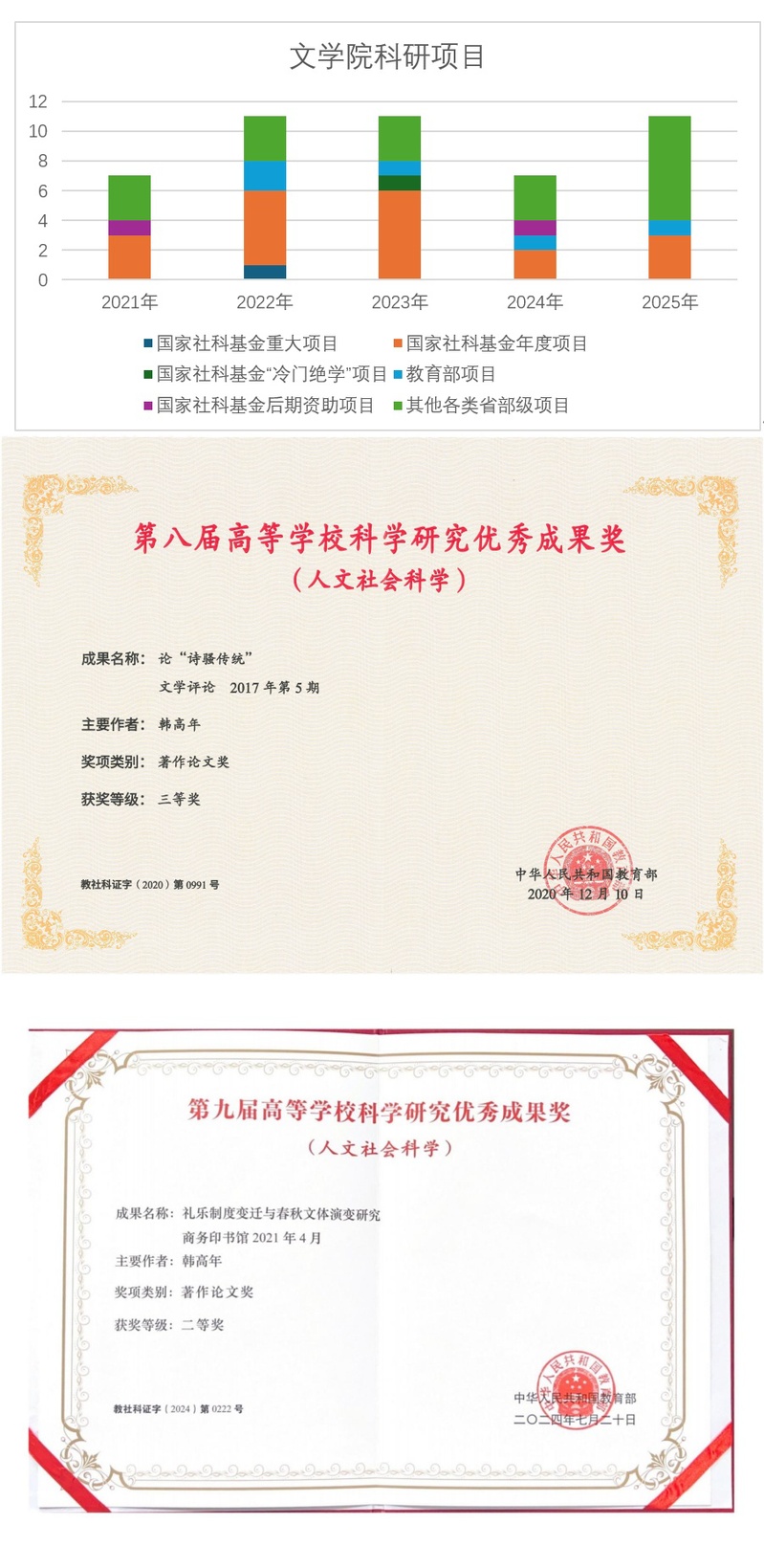“十四五”期间,学院获批国家社科基金重大项目1项、重点项目1项,及其他国家级、部级项目23项,科研总经费734万元。出版专著72部,在《文学评论》《文学遗产》《文艺研究》等权威刊物发表A类论文135篇。获教育部高等学校科学研究优秀成果奖2项,甘肃省哲学社会科学优秀成果奖34项(一等奖6项)。韩高年教授连续两年(2024、2025)入选“中国高被引学者”榜单,学术影响力持续扩大。