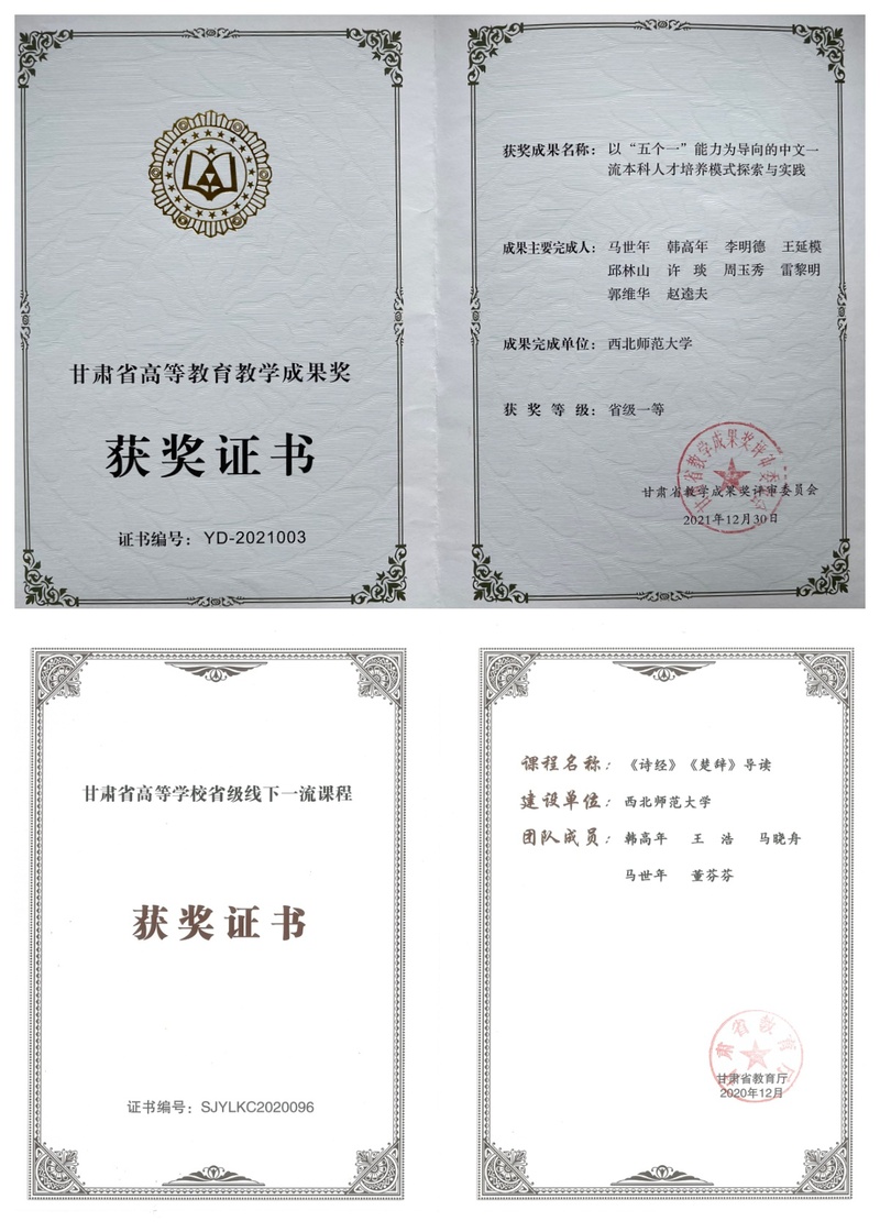 课程与教材建设成效显著,《〈诗经〉〈楚辞〉导读》《西方现代派文学》获批国家级一流本科课程,《先秦诸子散文导读》《外国文学》等获评省级一流课程。汉语言文学专业获批甘肃省高校课程思政示范专业,建成2个省级课程 思政教学团队,“甘肃省普通高校中国语言文学类专业教材建设研究基地”获准立项。