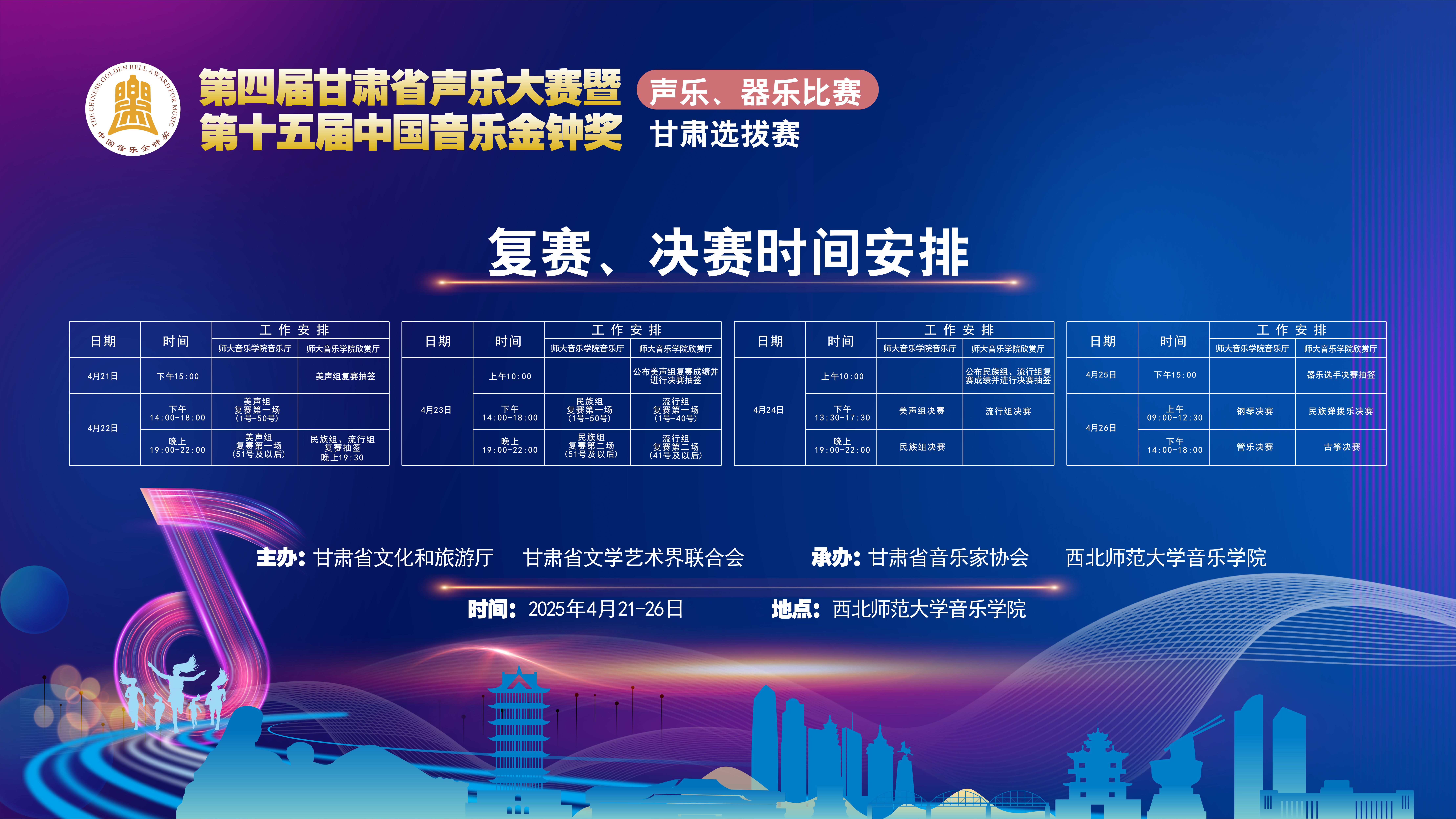第四届甘肃声乐大赛暨第十五届中国音乐金钟奖声乐、器乐甘肃选拔赛时间:2025年4月21日—26日地点:beat365在线登录官网云亭校区音乐厅 -